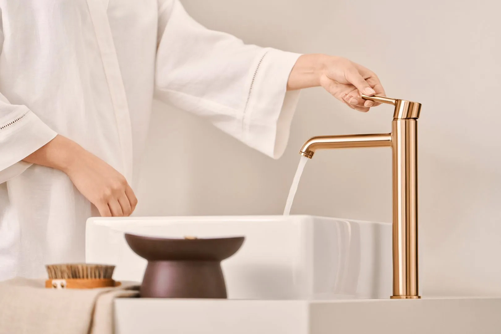 Für gehobene Designansprüche steht HANSAVANTIS STYLE zur Verfügung. Die Design-Armatur besticht durch ihre puristische und zeitlos elegante Erscheinung. In fünf Optionen und den vier Oberflächenvarianten Brushed Bronze, Brushed Steel, Chrome und Matt Black lässt sie sich perfekt in anspruchsvolle Badplanungen einsetzen. Je nach persönlichen Vorlieben als solitärer Blickfang oder perfekt integrierter Begleiter eines harmonischen Gesamt-Ensembles.